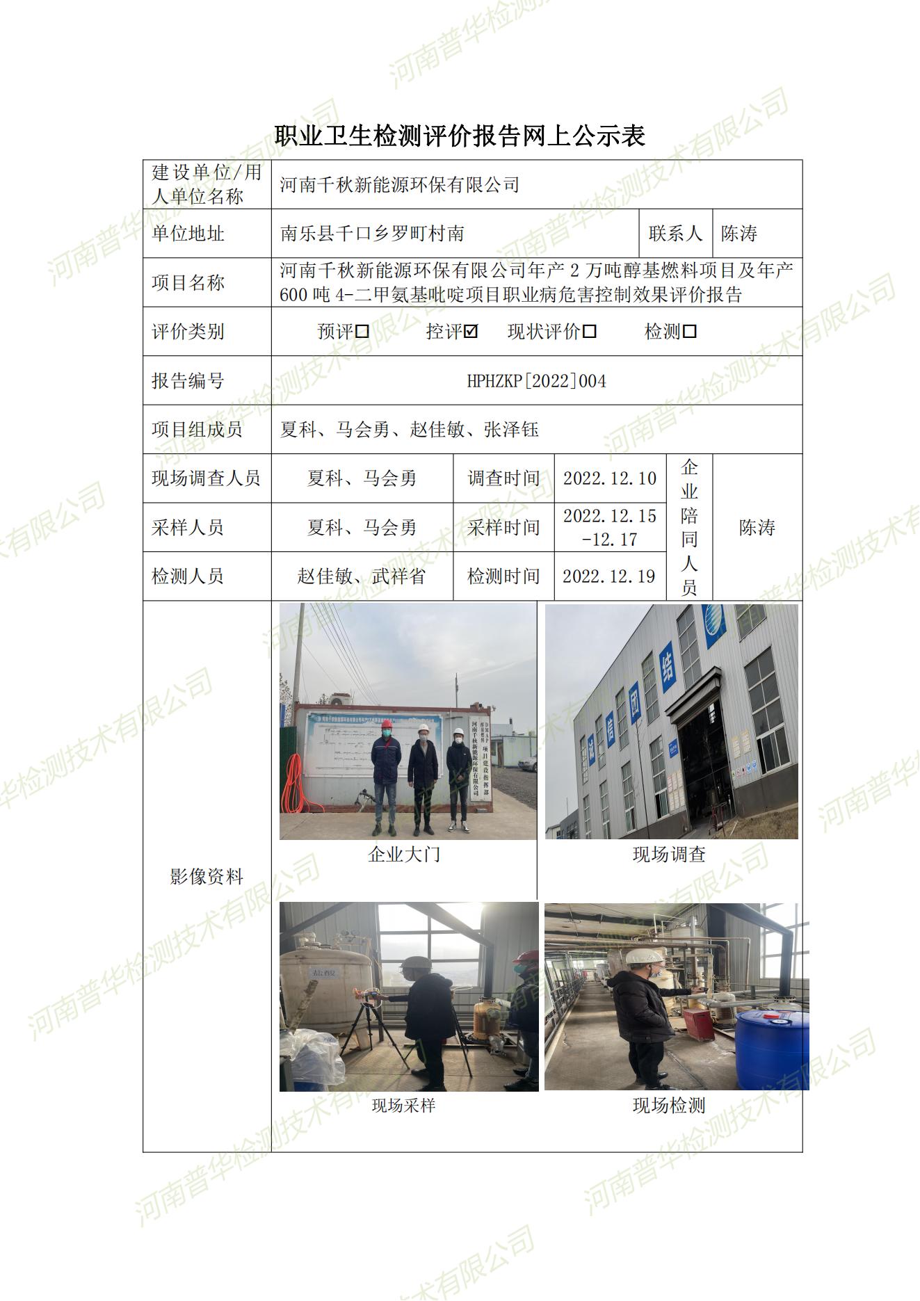 河南千秋新能源環(huán)保有限公司年產(chǎn)2萬噸醇基燃料項目及年產(chǎn)600噸4-二甲氨基吡啶項目職業(yè)病危害控制效果評價 點擊次數(shù):1180 次