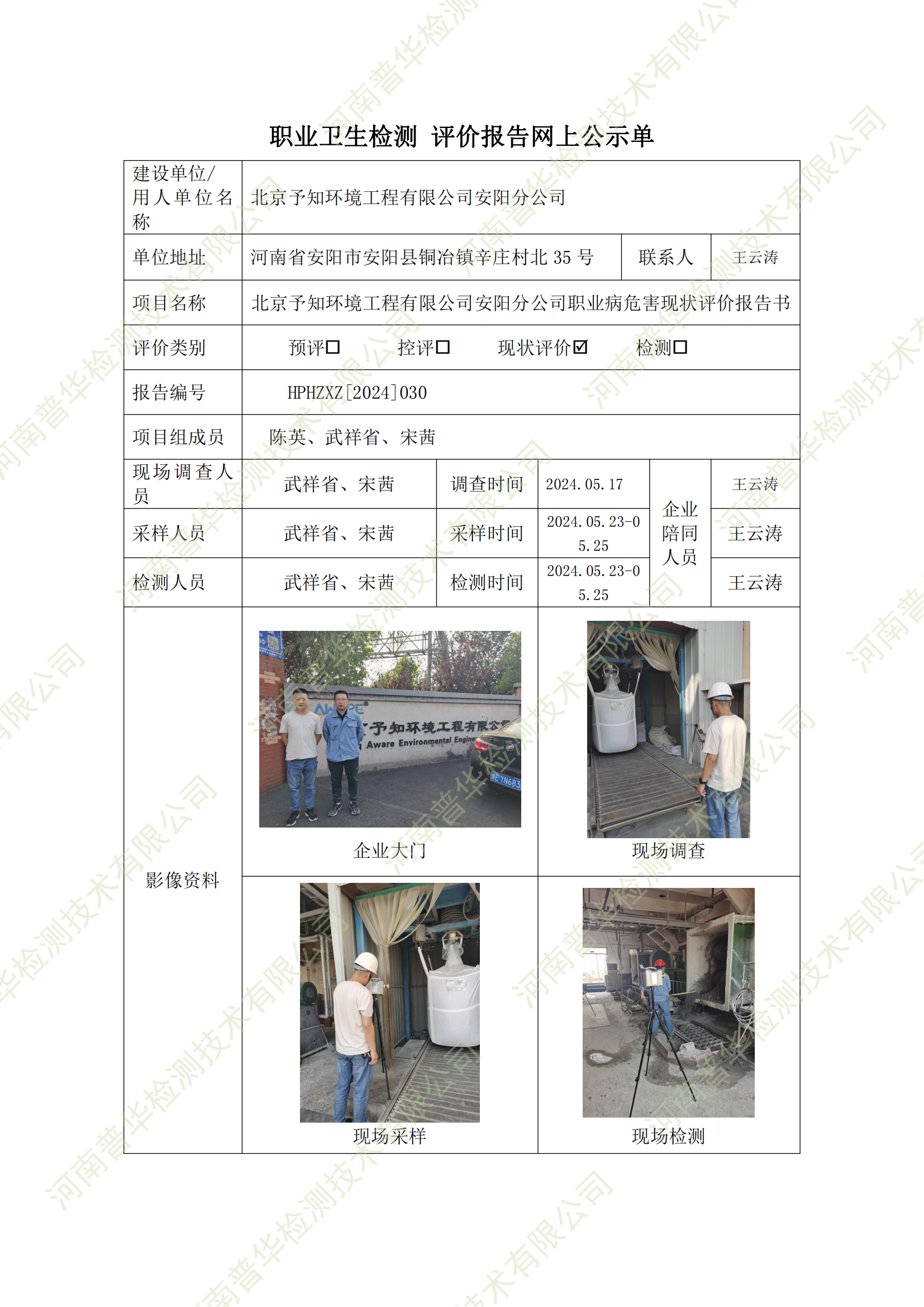 北京予知環(huán)境工程有限公司安陽分公司職業(yè)病危害現(xiàn)狀評價 點擊次數(shù):870 次